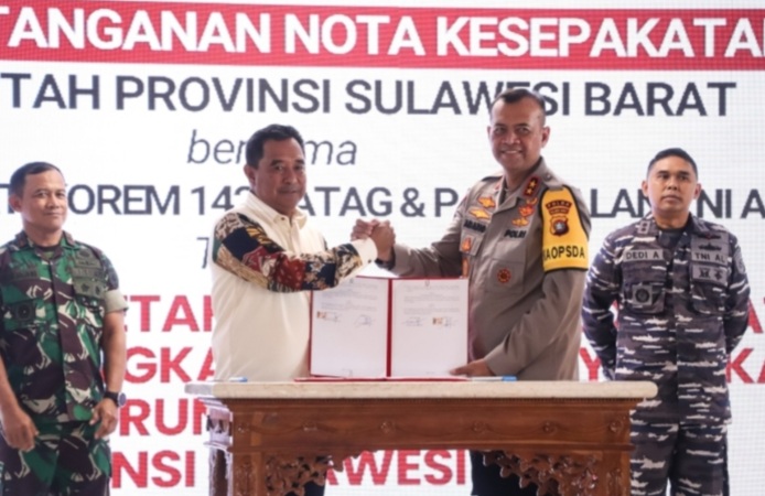 Mamujuekspres.com|MAMUJU|–Pj Gubernur Sulbar Bahtiar Baharuddin bersama Kapolda Sulbar Irjen Pol Adang Ginanjar, Danrem 142/Tatag Brigjen TNI Deni Rejeki, Danlanal Mamuju Letkol Dedi Andriyatno menandatangani Nota Kesepahaman di Graha Sandeq Komplek Rujab Gubernur Sulbar, Senin, 3 Juni 2024.